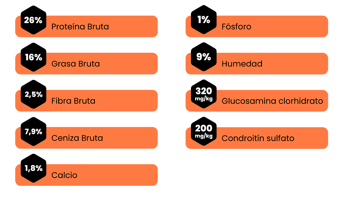 Vitamina A 20.000 U.I/Kg, vitamina D-31.800 U.I/ Kg, vitamina E (acetato de α-tocoferol) 200 mg/ Kg, vitamina C 100 mg/ Kg, L-Carnitina 40 mg/ Kg, taurina 500 mg/Kg, Fe (sulfato de hierro II monohidratado) 75 mg/Kg, Cu (sulfato de cobre II pentahidratado) 10 mg/Kg, Mn (sulfato manganoso monohidratado) 25 mg/Kg, Zn (sulfato de zinc monohidratado)110 mg/Kg, I (yoduro de potasio) 2 mg/Kg, Se (selenito de sodio) 0,1 mg/Kg.