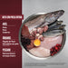 Pavo crudo (19%), pollo fresco (18,5%), codorniz cruda (4%), merluza entera cruda (4%), arenque entero crudo (4%), hígado de pavo crudo (4%), menudillos de pollo frescos (hígado, corazón) (4%), huevos frescos (4%), pavo deshidratado (4%), pollo deshidratado (4%), arenque deshidratado (4%), hígado de pollo deshidratado (4%), huevo deshidratado (4%), lentejas rojas enteras, judías pintas enteras, lentejas verdes enteras, grasa de pollo (3%), judías blancas enteras, garbanzos enteros, fibra de lentejas, guisantes enteros, aceite de abadejo (0,5%), almidón de guisantes, alga kelp deshidratada, mejillones verdes de Nueva Zelanda, calabaza entera fresca, calabaza butternut entera fresca, sal, manzanas enteras frescas, zanahorias enteras frescas, peras enteras frescas, calabacín entero fresco, raíz de achicoria deshidratada, grelos frescos, col rizada fresca, espinacas frescas, hojas de remolacha frescas, arándanos rojos enteros, arándanos azules enteros, bayas de saskatoon enteras, cúrcuma, cardo lechoso, raíz de bardana, lavanda, raíz de malvavisco, escaramujos.